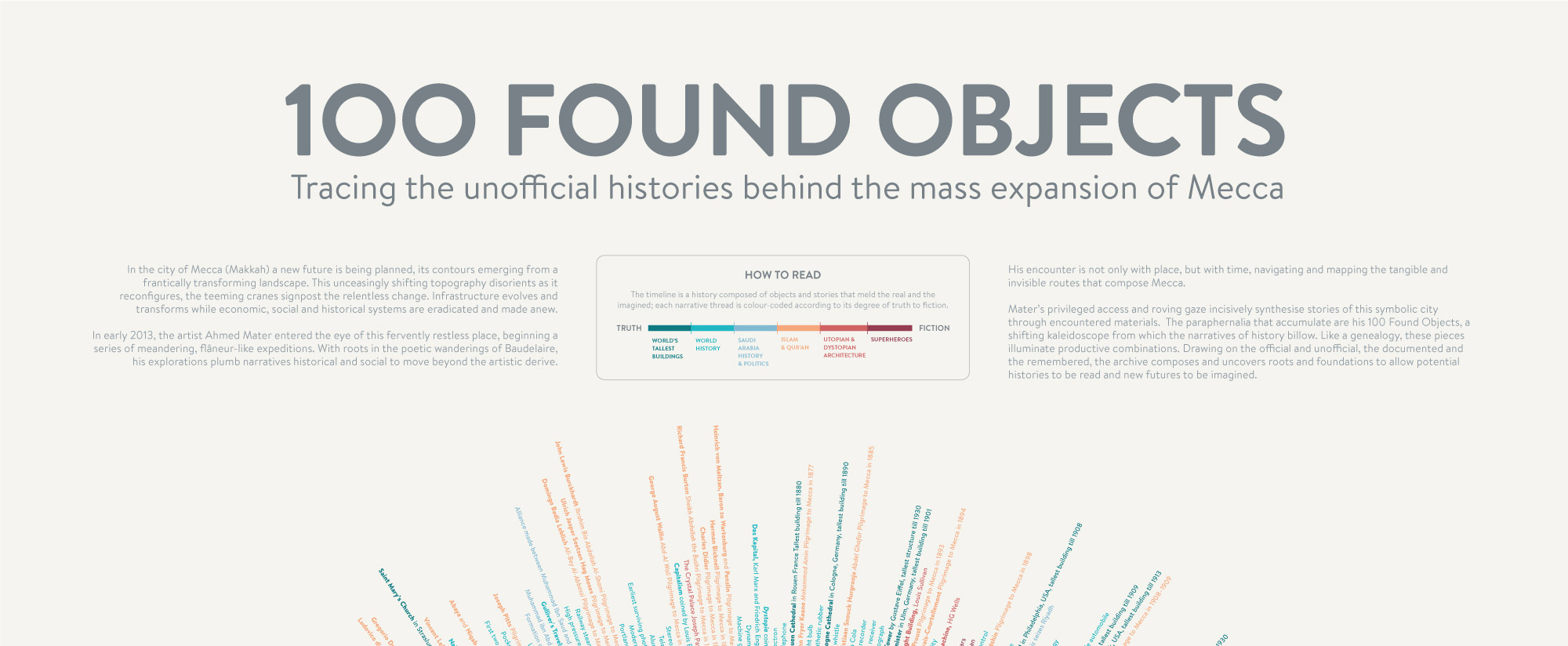 This complex infographic was commissioned by the Saudi artist Ahmed Mater for inclusion in his exhibition of 100 Found Objects at the Sharjah Art Foundation. The infographic traces the unofficial histories behind the mass expansion of Mecca, utilizing object-oriented ontology methodologies to explore the intersection of history, memory, and perception. Spanning from the pre-common era (BCE) to the 2010s (CE) and beyond, the timeline captures the evolving relationship between Mecca’s past and its rapidly changing future.